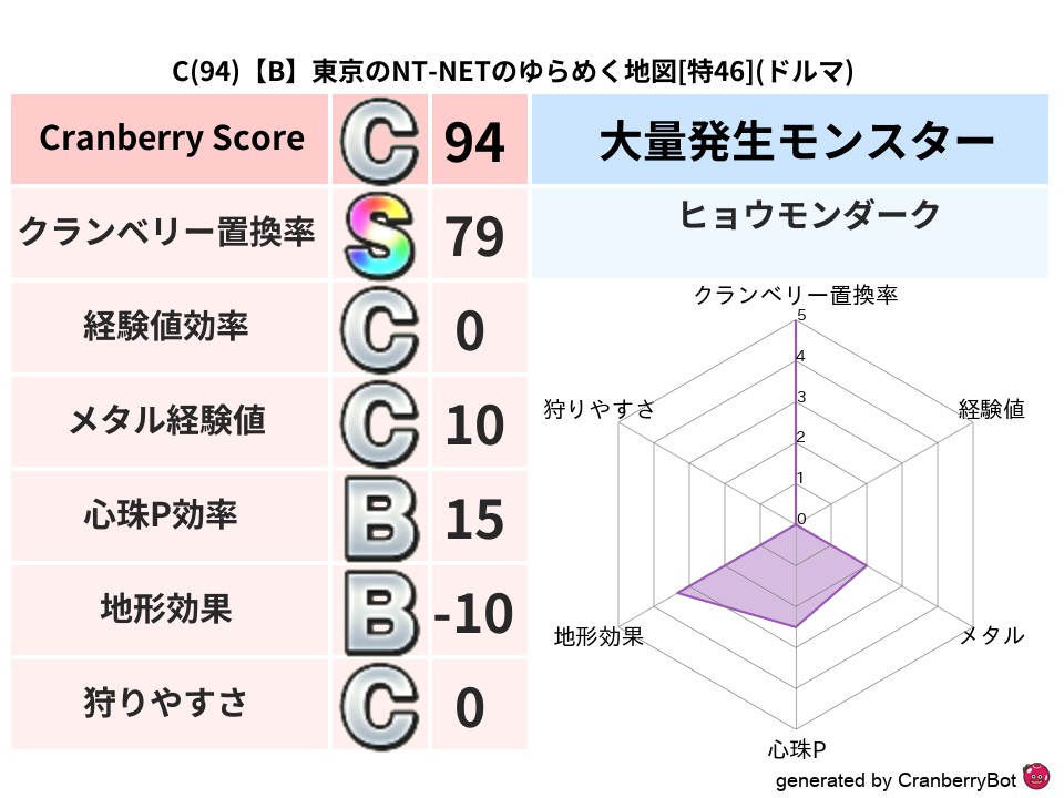 B(128)【B】東京のはなずしのねむれる地図[特70](ドルマ) 地図判定結果 2025/01/12 22:082025/06/28 15:04 地図判定結果 ドルマファーラット (まだ評価がありません)読み込み中... 🤍 登録する コメントを見る(0件)クランベリーボット判定結果の詳細 クランベリースコア:128 クランベリー置換率:36% 大量発生モンスター:ファーラット ドルマ超耐性(1%) 超耐性・弱耐性なし:バギ 系統狩り[けもの系](54%)