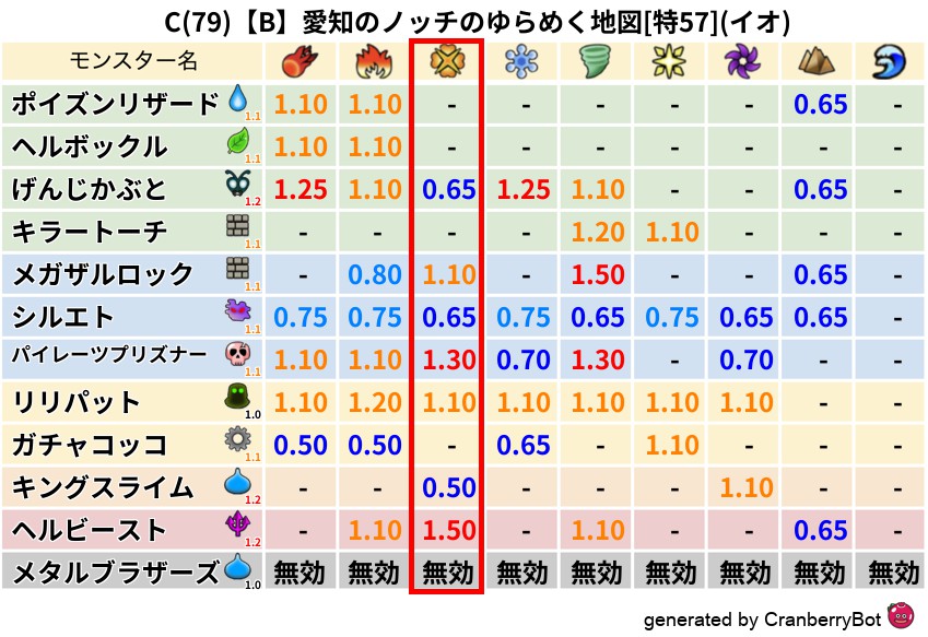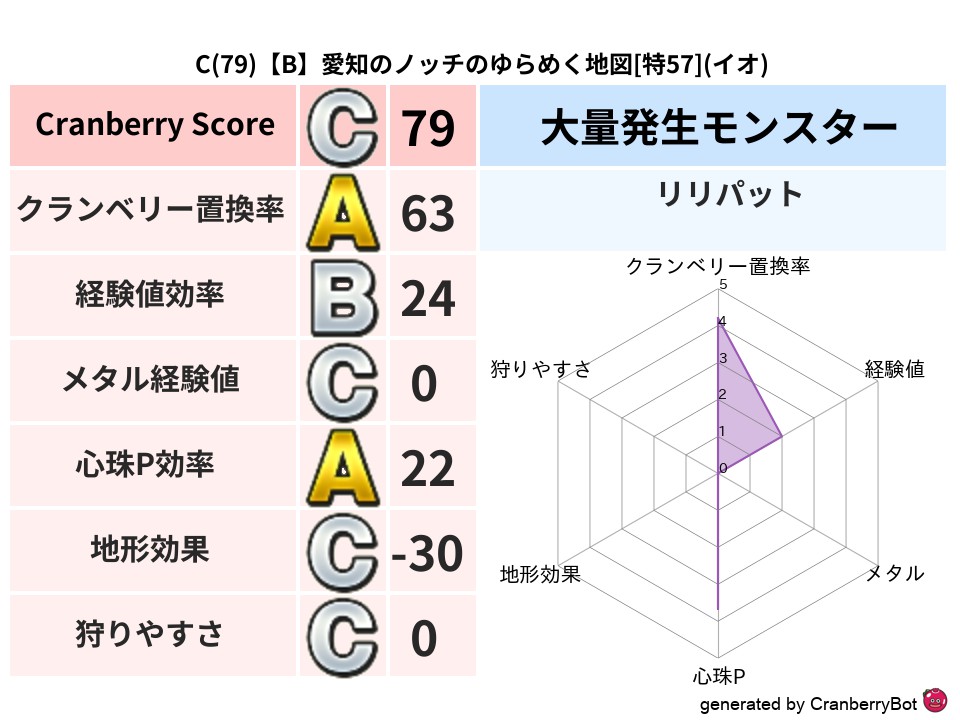 C(79)【B】愛知のノッチのゆらめく地図[特57](イオ) 地図判定結果 2023/12/17 21:252025/11/11 22:18 地図判定結果 イオリリパット (まだ評価がありません)読み込み中... 🤍 登録する クランベリーボット判定結果の詳細 クランベリースコア79 クランベリー置換率63% 大量発生モンスターリリパット 超耐性イオ(0%) こころ道 完全一致モンスター ヘルボックル魔剣士(魔道Lv30) メガザルロックゴッドハンド(武道Lv10)大魔道士(理力道Lv10) リリパットゴッドハンド(守護道Lv20) ガチャコッコ魔剣士(魔道Lv20) キングスライムゴッドハンド(武道Lv30) メタルブラザーズゴッドハンド(武道Lv60) この地図を探す・受け取る 「愛知のノッチのゆらめく地図」をみんドラで探す クランベリーランキング ランキング情報を読み込み中... こういう地図は是非シェアを! ⭐5の項目が一つでもあれば捨てずに配布してみてください もしかしたら全国制覇の地図になるかも! クランベリースコア:これまで判定した地図での順位、上位100位はかなりレア✨ クランベリー置換率:大量発生モンスター別の順位、最高置換率の地図は人気が高い 経験値効率:各モンスターの出現率を加味した1戦闘あたりの期待値 心珠P効率:各モンスターの出現率×Dランクの心珠P 最高系統出現率:一番出現率の高いモンスターの系統、こころドロップ率アップの参考に! 4ぶきカバー率:ぶき4種でドロップ率アップが狙える割合、スライアスロンの時に輝く地図になるかも?