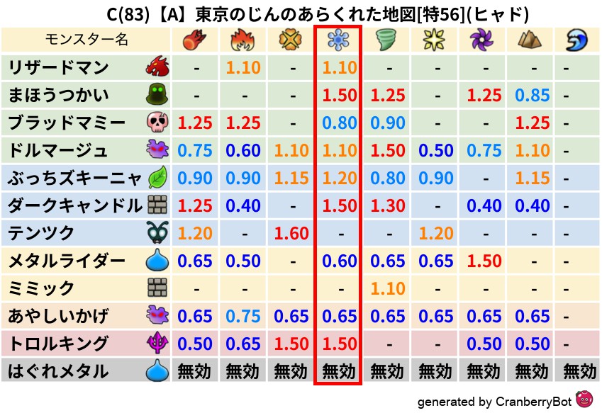 C(83)【A】東京のじんのあらくれた地図[特56](ヒャド) 地図判定結果 2024/03/04 23:012025/06/28 15:22 地図判定結果 ぶっちズキーニャヒャド (まだ評価がありません)読み込み中... 🤍 登録する コメントを見る(0件)クランベリーボット判定結果の詳細 クランベリースコア:83 クランベリー置換率:64% 大量発生モンスター:ぶっちズキーニャ ヒャド超耐性(0%) こころ道 完全一致モンスター ダークキャンドル: ゴッドハンド(守護道Lv10) テンツク: 大魔導士(魔力道Lv20) メタルライダー: 天地雷鳴士(地道Lv20) ミミック: ドラゴン(人道Lv20) あやしいかげ: ニンジャ(風道Lv30) トロルキング: 大魔導士(理力道Lv40) この地図を探す・受け取る Discordの判定結果を見る 「東京のじんのあらくれた地図」をみんドラで探す