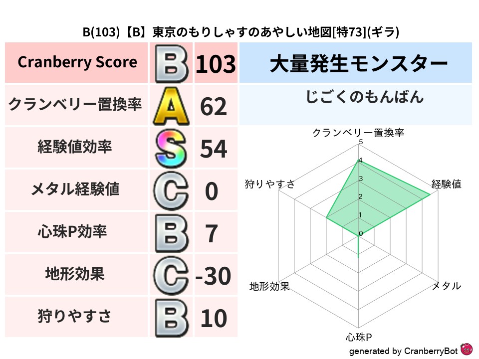 B(145)【A】静岡の×20Aのさまよえる地図[特73](ドルマ) 地図判定結果 2025/08/04 16:53 地図判定結果 ドルマ (まだ評価がありません)読み込み中... 🤍 登録する コメントを見る(0件)クランベリーボット判定結果の詳細 クランベリースコア:145 クランベリー置換率:46% 大量発生モンスター:げんじゅつし ドルマ超耐性(0%) こころ道 完全一致モンスター ジェリーマン: 魔剣士(魔道Lv5) ナイトキャット: 守り人(まもり道Lv30) ミニデーモン: 大魔導士(魔力道Lv10) メタッピー: ドラゴン(竜道Lv20) ドラゴスライム: ニンジャ(風道Lv20) じごくのつかい: ニンジャ(風道Lv60) メタルエンゼル: 守り人(ささえ道Lv60) この地図を探す・受け取る Discordの判定結果を見る 「静岡の×20Aのさまよえる地図」をみんドラで探す