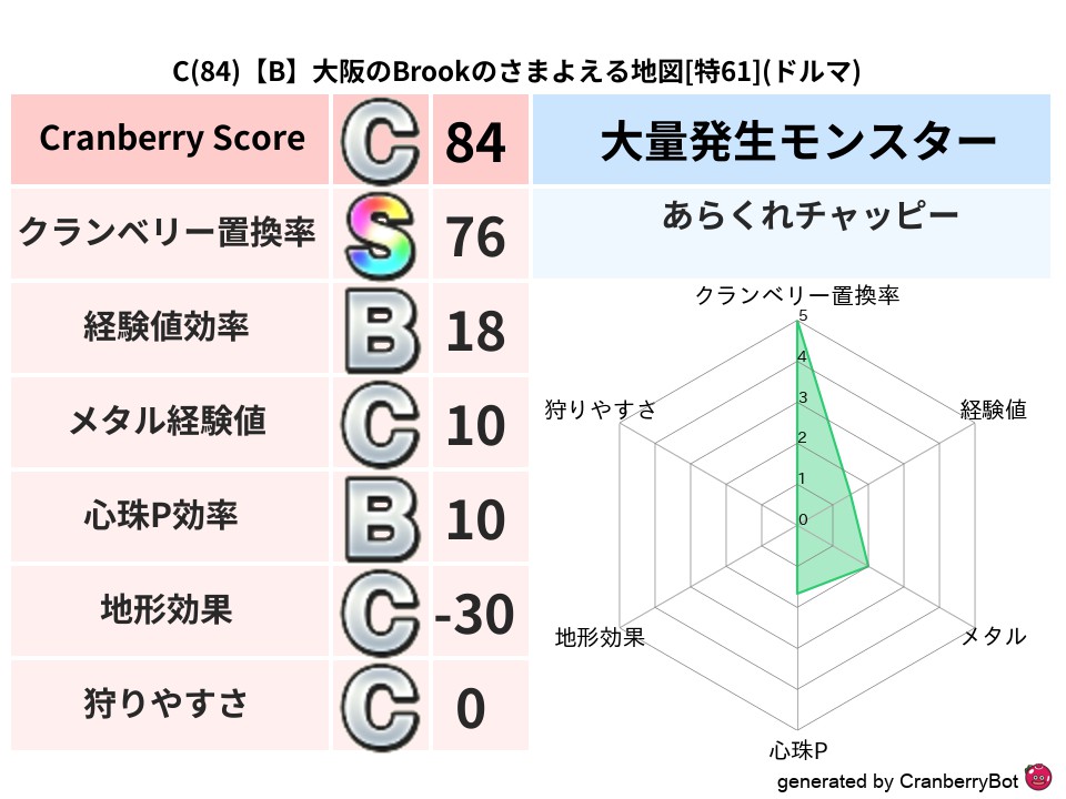 C(99)【B】大阪のBrookのさまよえる地図[特61](ドルマ) 地図判定結果 2024/10/23 22:232025/06/28 15:09 地図判定結果置換率S あらくれチャッピードルマ (まだ評価がありません)読み込み中... 🤍 登録する コメントを見る(0件)クランベリーボット判定結果の詳細 クランベリースコア:99 クランベリー置換率:76% 大量発生モンスター:あらくれチャッピー ドルマ超耐性(54%) こころ道 完全一致モンスター デビルアーマー: 大神官(舞道Lv5) ベビーサラマンダ: 大神官(舞道Lv5) つかいま: 大魔導士(理力道Lv5) シールドオーガ: ニンジャ(波道Lv20) ほのおのせんし: 大神官(祈道Lv20) メタルホイミン: ドラゴン(竜道Lv50) この地図を探す・受け取る Discordの判定結果を見る 「大阪のBrookのさまよえる地図」をみんドラで探す