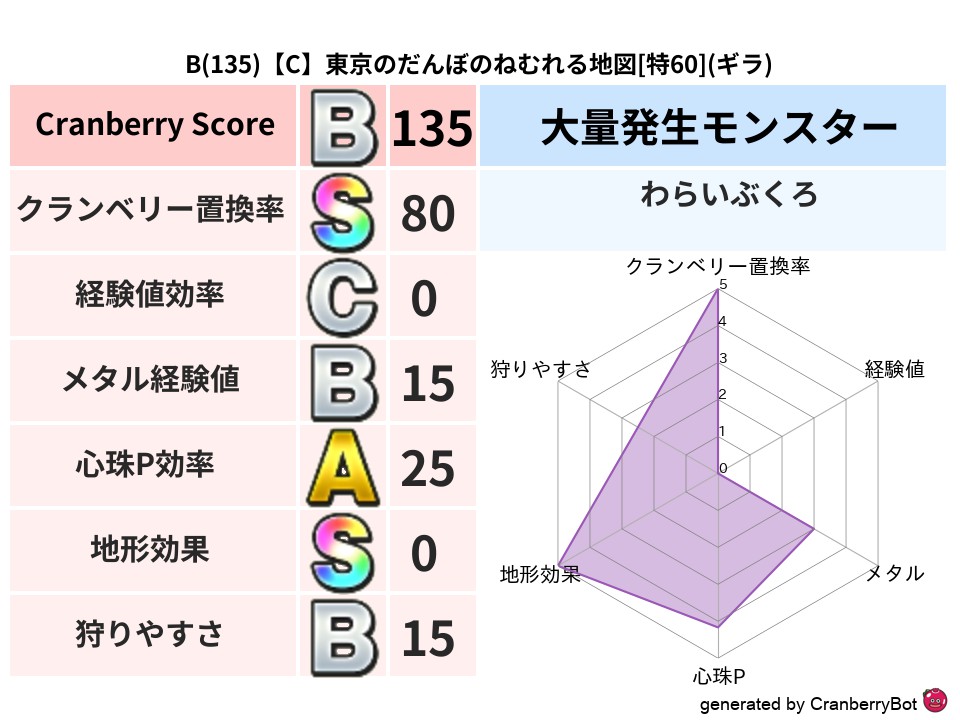 B(125)【C】大阪のスバルのあらくれた地図[特70](デイン) 地図判定結果 2024/10/30 13:202025/06/28 15:09 地図判定結果 じごくのもんばんデイン (まだ評価がありません)読み込み中... 🤍 登録する コメントを見る(0件)クランベリーボット判定結果の詳細 クランベリースコア:125 クランベリー置換率:63% 大量発生モンスター:じごくのもんばん デイン超耐性(53%) 系統狩り[悪魔系](61%) こころ道 完全一致モンスター ジェリーマン: 魔剣士(魔道Lv5) グリゴンダンス: 魔人(超魔道Lv5) ぐんたいガニ: 守り人(ささえ道Lv10) スナノサウルス: 大神官(舞道Lv30) ガチャコッコ: 魔剣士(魔道Lv20) うごくせきぞう: 魔剣士(魔道Lv50) この地図を探す・受け取る Discordの判定結果を見る 「大阪のスバルのあらくれた地図」をみんドラで探す