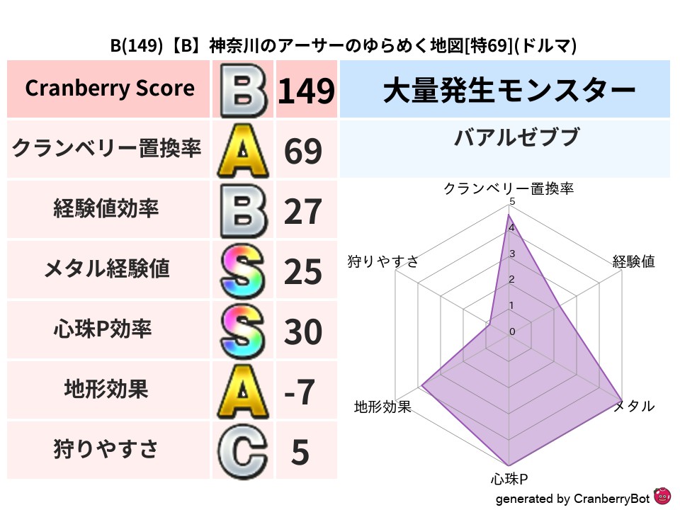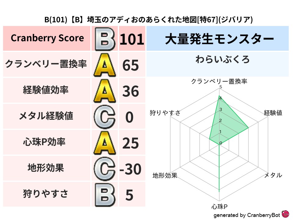 B(136)【A】山口のソラののろいの地図[特69](デイン) 地図判定結果 2025/04/18 20:542025/06/28 14:57 地図判定結果 スライムつむりデイン (まだ評価がありません)読み込み中... 🤍 登録する コメントを見る(0件)クランベリーボット判定結果の詳細 クランベリースコア:136 クランベリー置換率:44% 大量発生モンスター:スライムつむり デイン超耐性(0%) 超耐性・弱耐性なし:バギ こころ道 完全一致モンスター どれいへいし: ドラゴン(人道Lv5) プリズニャン: ニンジャ(共通Lv1) イエティ: 魔剣士(刃道Lv10) ヒョウモンダーク: 大魔導士(魔力道Lv30) ようがんまじん: 守り人(ささえ道Lv40) ドラゴメタル: ゴッドハンド(守護道Lv30) この地図を探す・受け取る Discordの判定結果を見る 「山口のソラののろいの地図」をみんドラで探す