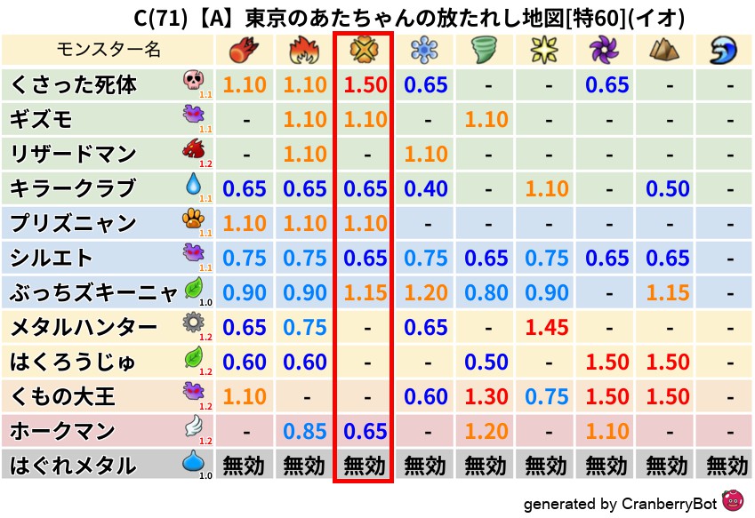 C(71)【A】東京のあたちゃんの放たれし地図[特60](イオ) 地図判定結果 2024/02/17 13:062025/11/11 22:02 地図判定結果 ぶっちズキーニャイオ (まだ評価がありません)読み込み中... 🤍 登録する クランベリーボット判定結果の詳細 クランベリースコア71 クランベリー置換率65% 大量発生モンスターぶっちズキーニャ 超耐性イオ(0%) こころ道 完全一致モンスター くさった死体ゴッドハンド(守護道Lv5)大魔道士(魔力道Lv5) ギズモ天地雷鳴士(共通Lv1) プリズニャンニンジャ(共通Lv1) メタルハンター魔剣士(刃道Lv40) はくろうじゅ大神官(祈道Lv20) くもの大王守り人(ささえ道Lv30) この地図を探す・受け取る 「東京のあたちゃんの放たれし地図」をみんドラで探す クランベリーランキング ランキング情報を読み込み中... こういう地図は是非シェアを! ⭐5の項目が一つでもあれば捨てずに配布してみてください もしかしたら全国制覇の地図になるかも! クランベリースコア:これまで判定した地図での順位、上位100位はかなりレア✨ クランベリー置換率:大量発生モンスター別の順位、最高置換率の地図は人気が高い 経験値効率:各モンスターの出現率を加味した1戦闘あたりの期待値 心珠P効率:各モンスターの出現率×Dランクの心珠P 最高系統出現率:一番出現率の高いモンスターの系統、こころドロップ率アップの参考に! 4ぶきカバー率:ぶき4種でドロップ率アップが狙える割合、スライアスロンの時に輝く地図になるかも?