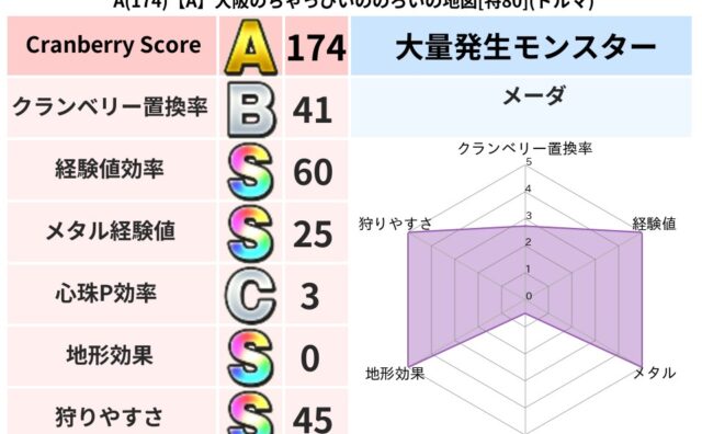 クランベリーボット判定結果の詳細クランベリースコア174クランベリー置換率41%大量発生モンスターメーダ超耐性ドルマ(0%)超耐性・弱耐性なしバギデインジバリア系統狩り虫系52%こころ道 完全一致モンスターメーダドラゴン(共通Lv1)どくイ...