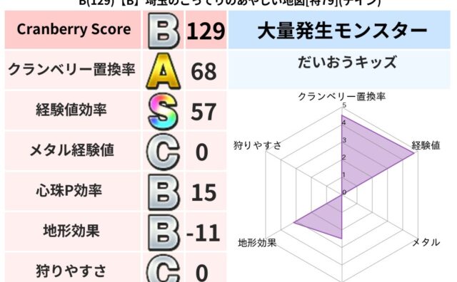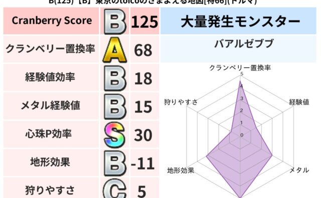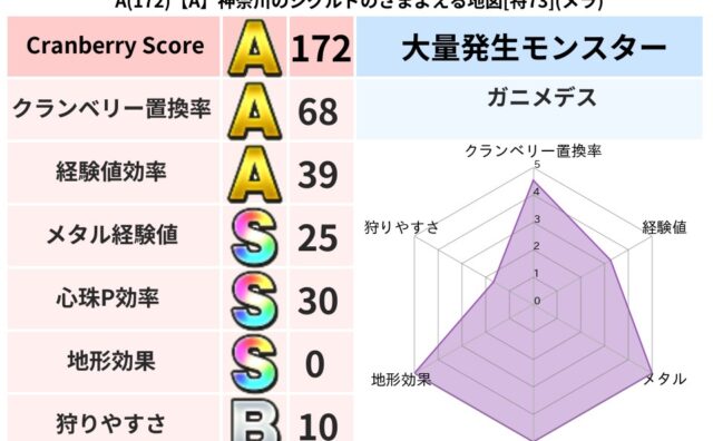 クランベリーボット判定結果の詳細クランベリースコア87クランベリー置換率73%大量発生モンスターマポレーナ,あらくれチャッピー超耐性ギラ(14%)こころ道 完全一致モンスターデビルアーマー大神官(舞道Lv5)しりょうのきし大神官(舞道Lv5...