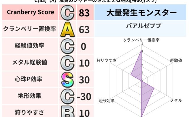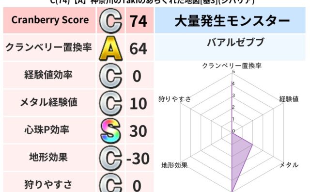 クランベリーボット判定結果の詳細クランベリースコア108クランベリー置換率63%大量発生モンスターバアルゼブブ超耐性メラ(52%)超耐性・弱耐性なしバギデイン系統狩り悪魔系43%こころ道 完全一致モンスターねこまどうニンジャ(風道Lv5)ヒ...
