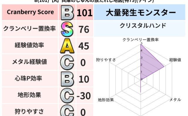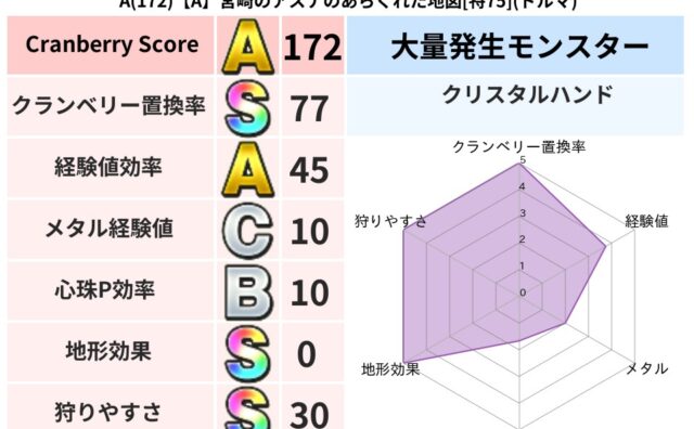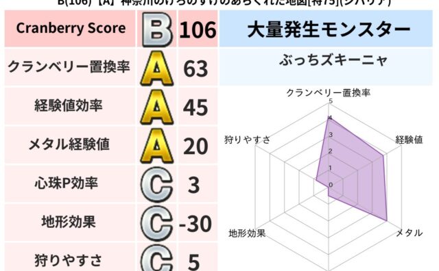 クランベリーボット判定結果の詳細クランベリースコア132クランベリー置換率23%超耐性バギ(0%)超耐性・弱耐性なしドルマ系統狩りけもの系53%こころ道 完全一致モンスターいっかくウサギゴッドハンド(守護道Lv5)ブラッドハンド魔剣士(魔道...