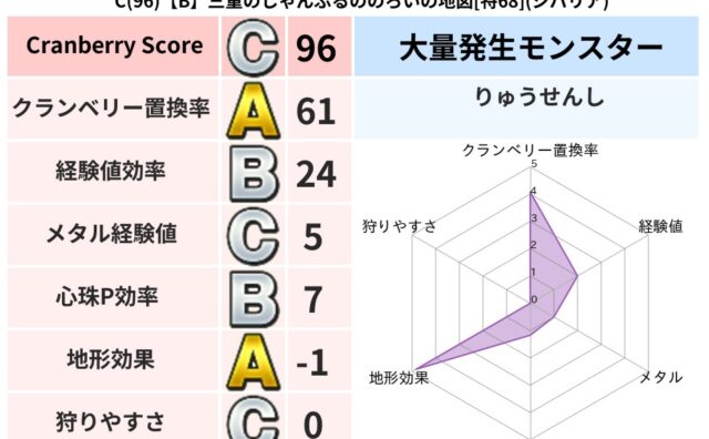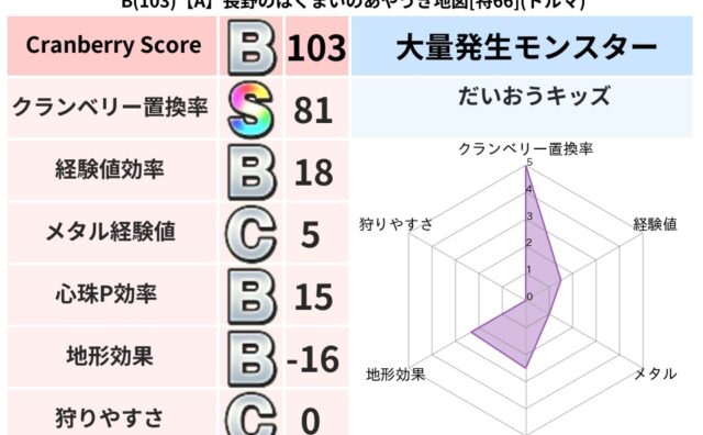 クランベリーボット判定結果の詳細クランベリースコア142クランベリー置換率68%大量発生モンスターわらいぶくろ超耐性バギ(5%)超耐性・弱耐性なしデイン系統狩り虫系48%こころ道 完全一致モンスターブラウニー守り人(共通Lv1)かっちゅうア...