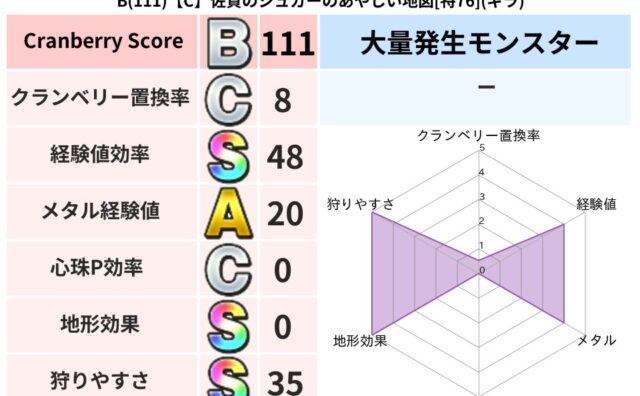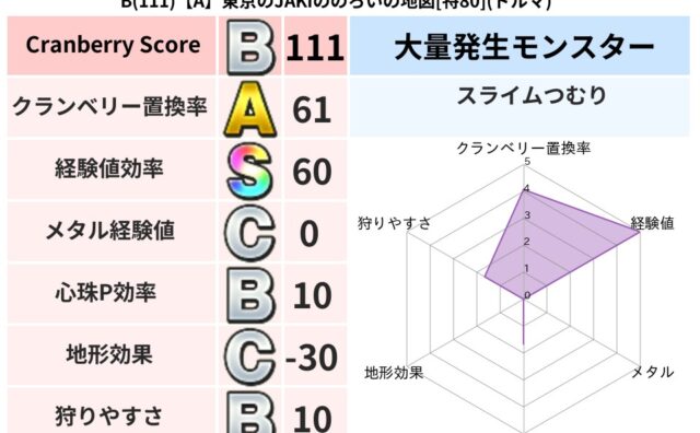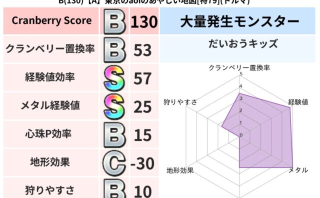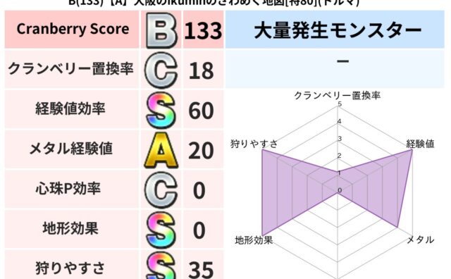 クランベリーボット判定結果の詳細クランベリースコア82クランベリー置換率61%大量発生モンスタードラゴンキッズ超耐性ジバリア(1%)こころ道 完全一致モンスターくさった死体ゴッドハンド(守護道Lv5)大魔道士(魔力道Lv5)ストーンマンゴッ...