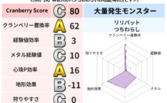 クランベリーボット判定結果の詳細クランベリースコア:163クランベリー置換率:77%大量発生モンスター:バアルゼブブ,ヒョウモンダークギラ超耐性(9%)超耐性・弱耐性なし:ジバリアこころ道 完全一致モンスターベロニャーゴ: 大魔導士(理力道...