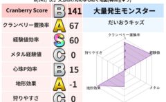 クランベリーボット判定結果の詳細クランベリースコア88クランベリー置換率68%大量発生モンスタースライムつむり超耐性メラ(13%)こころ道 完全一致モンスターかっちゅうアリ魔人(共通Lv1)パペットマン天地雷鳴士(天道Lv5)しましまキャッ...
