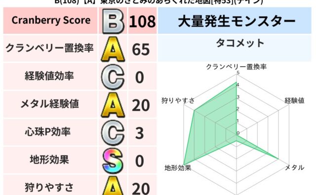 地図判定結果 B(131)【A】東京のさとみのあらくれた地図[特53](デイン) クランベリーボット判定結果の詳細クランベリースコア:131クランベリー置換率:65%大量発生モンスター:タコメットデイン超耐性(0%)こころ道 完全一致モンスタードロヌーバ: ニンジャ(波道Lv5)どれいへいし: ドラゴン(人道Lv5)スマ... 2024/01/12 21:32 地図判定結果