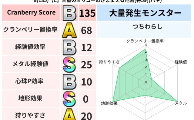 地図判定結果 B(135)【C】三重のオリコーのさまよえる地図[特59](バギ) クランベリーボット判定結果の詳細クランベリースコア:135クランベリー置換率:68%大量発生モンスター:つちわらしバギ超耐性(0%)こころ道 完全一致モンスターキャットフライニンジャ(共通Lv1)どろにんぎょう守り人(まもり道Lv20)ダー... 2024/01/12 17:02 地図判定結果