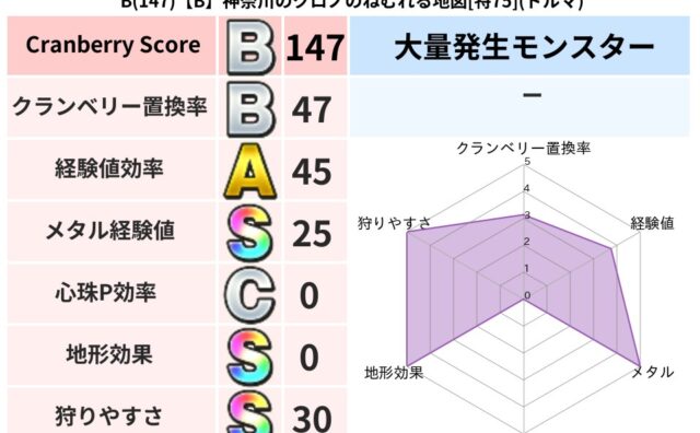 クランベリーボット判定結果の詳細クランベリースコア136クランベリー置換率53%大量発生モンスターホイミスライム超耐性ドルマ(0%)こころ道 完全一致モンスターホイミスライムニンジャ(波道Lv5)かっちゅうアリ魔人(共通Lv1)おおさそりゴ...