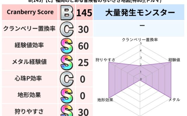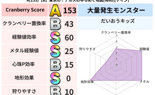 クランベリーボット判定結果の詳細クランベリースコア113クランベリー置換率61%大量発生モンスターじごくのもんばん超耐性デイン(52%)系統狩り悪魔系42%こころ道 完全一致モンスターキャットフライニンジャ(共通Lv1)パペットマン天地雷鳴...
