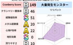 クランベリーボット判定結果の詳細クランベリースコア98クランベリー置換率69%大量発生モンスターナスビナーラ超耐性デイン(0%)こころ道 完全一致モンスターブラウニー守り人(共通Lv1)ストーンマンゴッドハンド(守護道Lv5)りゅうき兵天地...