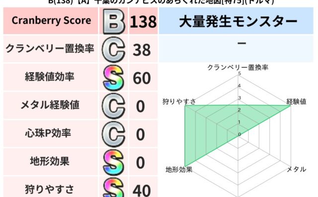 クランベリーボット判定結果の詳細クランベリースコア152クランベリー置換率57%大量発生モンスタースライムつむり,クリスタルハンド超耐性デイン(0%)系統狩り物質系49%こころ道 完全一致モンスターばくだん岩大神官(舞道Lv5)ストーンマン...
