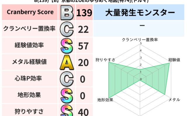 クランベリーボット判定結果の詳細クランベリースコア98クランベリー置換率77%大量発生モンスタードラゴンキッズ超耐性イオ(78%)超耐性・弱耐性なしドルマ系統狩りドラゴン系40%こころ道 完全一致モンスターどくろあらいゴッドハンド(守護道L...