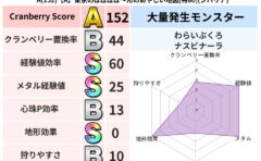 クランベリーボット判定結果の詳細クランベリースコア:79クランベリー置換率:69%大量発生モンスター:じごくのもんばんドルマ超耐性(0%)系統狩り(49%)こころ道 完全一致モンスターくさった死体: ゴッドハンド(守護道Lv5),大魔導士(...