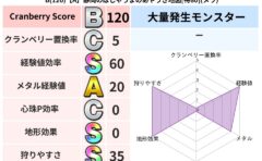 クランベリーボット判定結果の詳細クランベリースコア81クランベリー置換率63%大量発生モンスターぶっちズキーニャ超耐性デイン(0%)こころ道 完全一致モンスターアイアンクック守り人(まもり道Lv5)どくイモムシニンジャ(波道Lv5)かっちゅ...