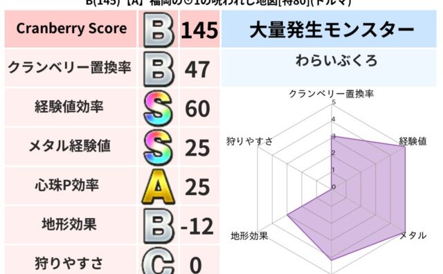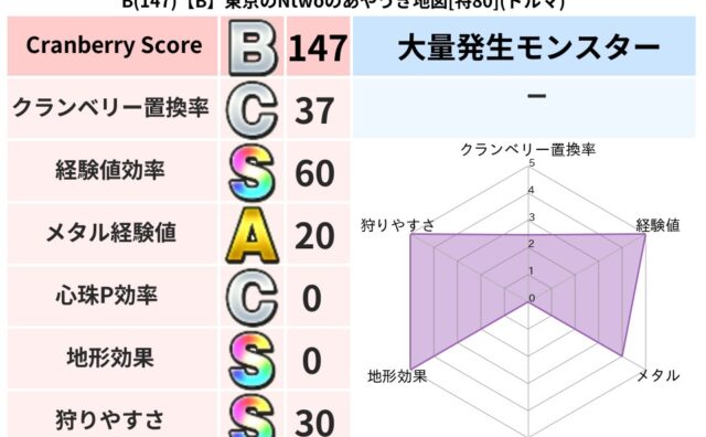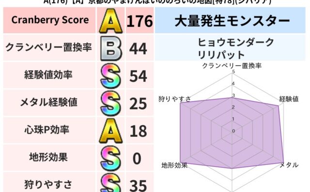 クランベリーボット判定結果の詳細クランベリースコア131クランベリー置換率66%大量発生モンスターバアルゼブブ超耐性ジバリア(46%)こころ道 完全一致モンスターフレイム守り人(ささえ道Lv5)だいまどうゴッドハンド(武道Lv40)マミー魔...