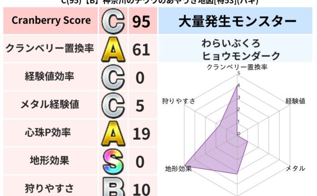 クランベリーボット判定結果の詳細クランベリースコア51クランベリー置換率63%大量発生モンスターぶっちズキーニャ超耐性ギラ(46%)こころ道 完全一致モンスターシャドーニンジャ(波道Lv30)グリゴンダンス魔人(超魔道Lv5)どろにんぎょう...