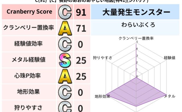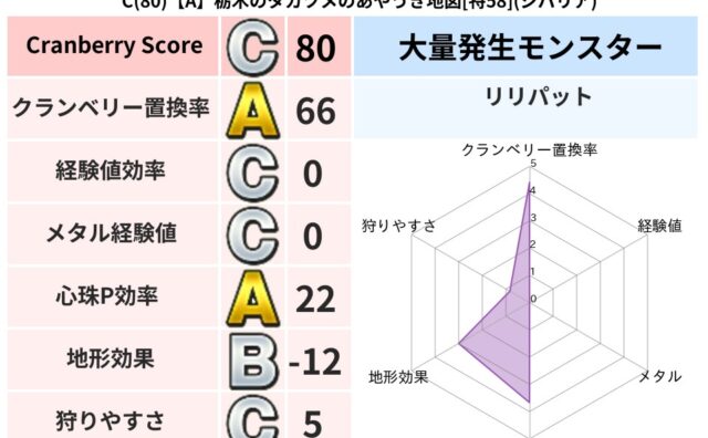 クランベリーボット判定結果の詳細クランベリースコア91クランベリー置換率71%大量発生モンスターわらいぶくろ超耐性ジバリア(46%)こころ道 完全一致モンスターベロニャーゴ大魔道士(理力道Lv5)てつのさそりゴッドハンド(守護道Lv5)大魔...