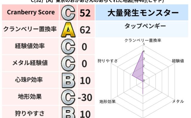 クランベリーボット判定結果の詳細クランベリースコア:70クランベリー置換率:71%大量発生モンスター:タップペンギードルマ超耐性(54%)こころ道 完全一致モンスターしのどれいゴッドハンド(守護道Lv5),大魔導士(魔力道Lv5)どれいへい...