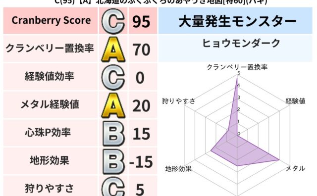 クランベリーボット判定結果の詳細クランベリースコア83クランベリー置換率65%大量発生モンスターバアルゼブブ超耐性ドルマ(18%)こころ道 完全一致モンスターどくどくゾンビ魔剣士(共通Lv1)かっちゅうアリ魔人(共通Lv1)ドロルメイジ大魔...