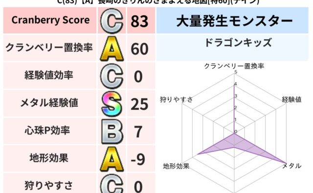 クランベリーボット判定結果の詳細クランベリースコア:105クランベリー置換率:67%大量発生モンスター:マポレーナギラ超耐性(0%)こころ道 完全一致モンスターフレイム: 守り人(ささえ道Lv5)かっちゅうアリ: 魔人(共通Lv1)だいまど...