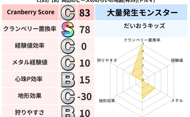 クランベリーボット判定結果の詳細クランベリースコア:63クランベリー置換率:63%大量発生モンスター:タップペンギーメラ超耐性(42%)系統狩り(41%)こころ道 完全一致モンスターおおさそりゴッドハンド(武道Lv5),ドラゴン(共通Lv1...