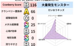 クランベリーボット判定結果の詳細クランベリースコア127クランベリー置換率77%大量発生モンスタードラゴンキッズ超耐性イオ(79%)系統狩りドラゴン系41%こころ道 完全一致モンスタースカルガルードラゴン(竜道Lv5)かっちゅうアリ魔人(共...