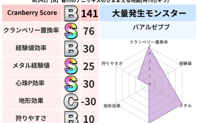 クランベリーボット判定結果の詳細クランベリースコア:106クランベリー置換率:87%大量発生モンスター:クリスタルハンドメラ超耐性(85%)こころ道 完全一致モンスターキースドラゴン大魔導士(理力道Lv5)ブリザードニンジャ(風道Lv10)...