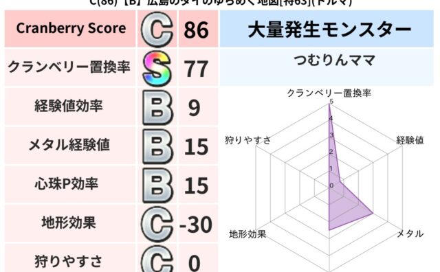クランベリーボット判定結果の詳細クランベリースコア:145クランベリー置換率:78%大量発生モンスター:メトロゴーストドルマ超耐性(48%)超耐性・弱耐性なし:ジバリア系統狩り(46%)こころ道 完全一致モンスターデビルアーマー: 大神官(...