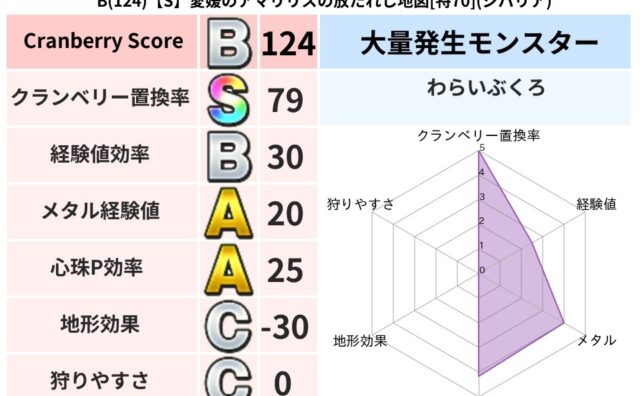 クランベリーボット判定結果の詳細クランベリースコア64クランベリー置換率76%大量発生モンスターズッキーニャ超耐性ギラ(45%)こころ道 完全一致モンスターしのどれいゴッドハンド(守護道Lv5)大魔道士(魔力道Lv5)リカントマムルドラゴン...