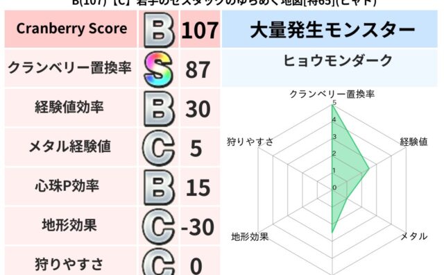 クランベリーボット判定結果の詳細クランベリースコア133クランベリー置換率76%大量発生モンスターマリンスライム,メーダロード超耐性ヒャド(66%)系統狩り虫系65%こころ道 完全一致モンスターデビルアーマー大神官(舞道Lv5)かっちゅうア...