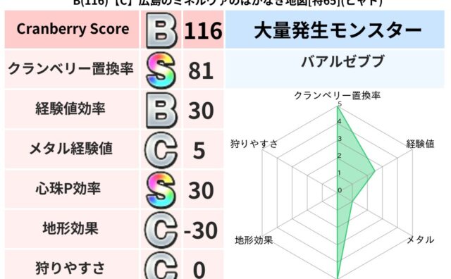 クランベリーボット判定結果の詳細クランベリースコア124クランベリー置換率75%大量発生モンスターヒョウモンダーク,わらいぶくろ超耐性ドルマ(0%)こころ道 完全一致モンスターリカントマムルドラゴン(竜道Lv5)フレイム守り人(ささえ道Lv...