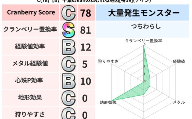 クランベリーボット判定結果の詳細クランベリースコア66クランベリー置換率81%大量発生モンスターつちわらし超耐性デイン(52%)こころ道 完全一致モンスタージェリーマン魔剣士(魔道Lv5)アイアンクック守り人(まもり道Lv5)しのさそり大神...