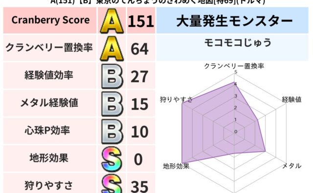 クランベリーボット判定結果の詳細クランベリースコア173クランベリー置換率69%大量発生モンスターバアルゼブブ超耐性イオ(0%)超耐性・弱耐性なしバギ系統狩り物質系48%悪魔系41%こころ道 完全一致モンスターみならいあくまニンジャ(風道L...