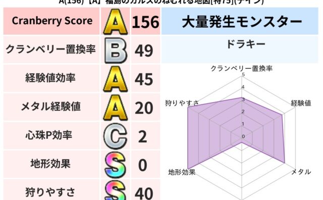クランベリーボット判定結果の詳細クランベリースコア172クランベリー置換率57%大量発生モンスターモコモコじゅう,メトロゴースト超耐性ドルマ(0%)超耐性・弱耐性なしデインジバリアこころ道 完全一致モンスターキメラ大魔道士(共通Lv1)ギズ...