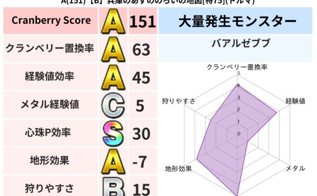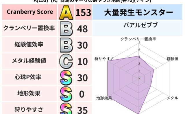 クランベリーボット判定結果の詳細クランベリースコア171クランベリー置換率50%大量発生モンスターバアルゼブブ超耐性バギ(0%)こころ道 完全一致モンスターがいこつ魔剣士(共通Lv1)ベロニャーゴ大魔道士(理力道Lv5)てつのさそりゴッドハ...