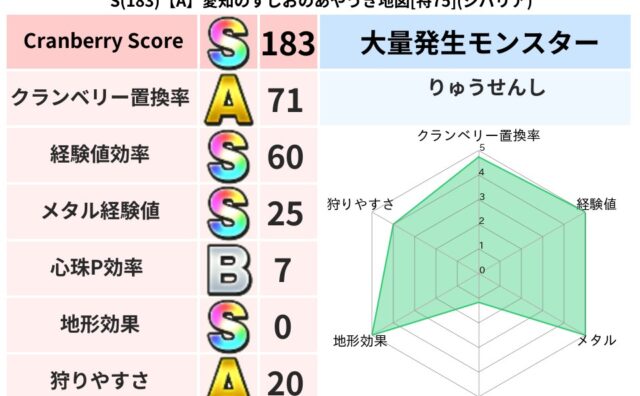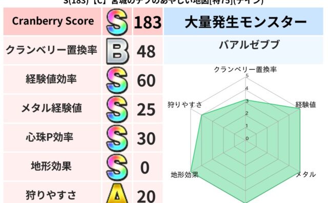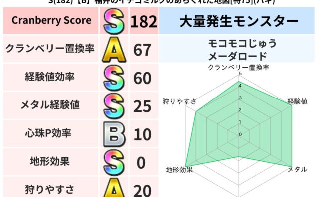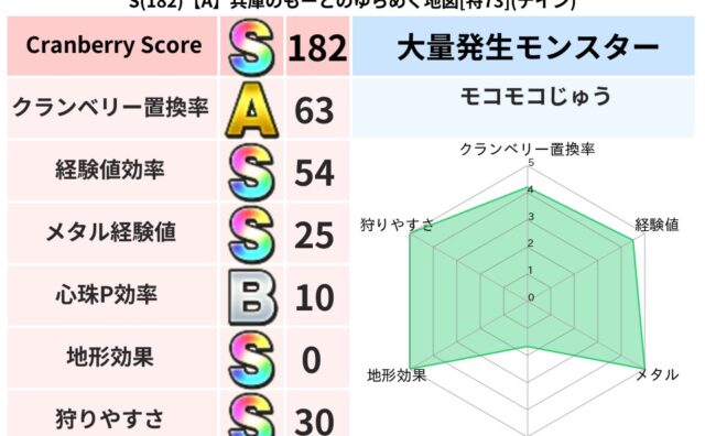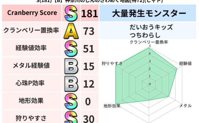 スコアS S(182)【A】兵庫のもーとのゆらめく地図[特73](デイン) クランベリーボット判定結果の詳細クランベリースコア182クランベリー置換率63%大量発生モンスターモコモコじゅう超耐性デイン(0%)超耐性・弱耐性なしイオバギこころ道 完全一致モンスターみならいあくまニンジャ(風道Lv5)どくイモムシニンジ... 2025/09/28 17:14 スコアS地図判定結果