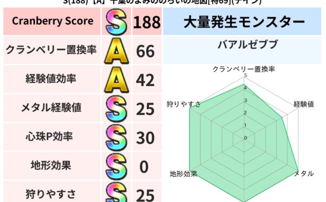 スコアS S(188)【A】千葉のよみののろいの地図[特69](デイン) クランベリーボット判定結果の詳細クランベリースコア188クランベリー置換率66%大量発生モンスターバアルゼブブ超耐性デイン(0%)超耐性・弱耐性なしバギこころ道 完全一致モンスターキメラ大魔道士(共通Lv1)ダークキャンドルゴッドハンド(守... 2025/05/11 03:02 スコアS地図判定結果