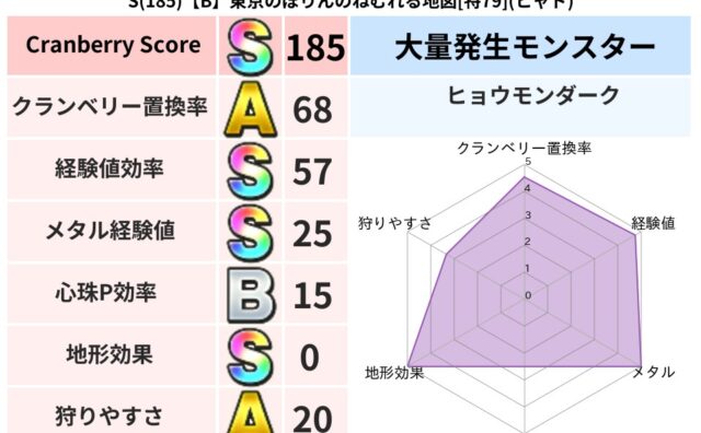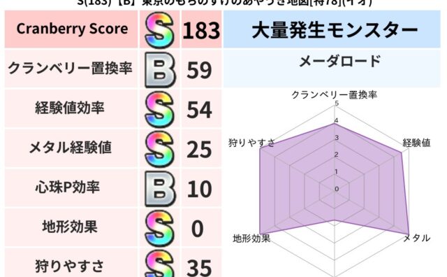 クランベリーボット判定結果の詳細クランベリースコア186クランベリー置換率56%大量発生モンスターメトロゴースト超耐性デイン(0%)系統狩りゾンビ系56%こころ道 完全一致モンスターしのどれいゴッドハンド(守護道Lv5)大魔道士(魔力道Lv...