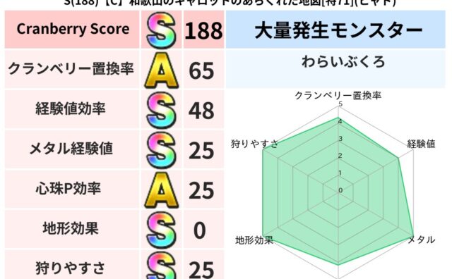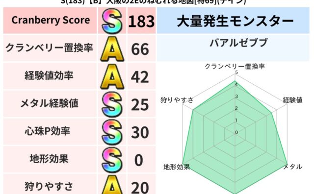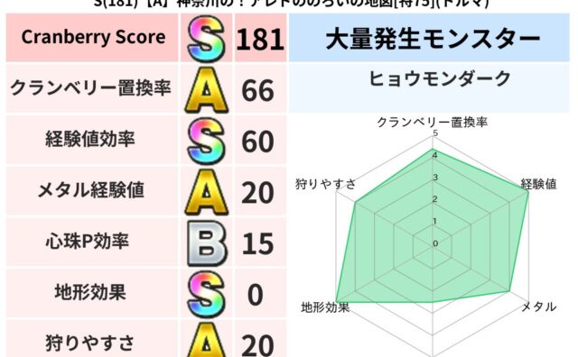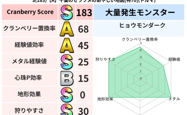 スコアS S(183)【A】千葉のセラツメのあやしい地図[特70](ドルマ) クランベリーボット判定結果の詳細クランベリースコア183クランベリー置換率68%大量発生モンスターヒョウモンダーク超耐性ドルマ(0%)系統狩り水系40%こころ道 完全一致モンスターベビーサラマンダ大神官(舞道Lv5)ストーンマンゴッドハンド... 2024/11/15 21:24 スコアS地図判定結果