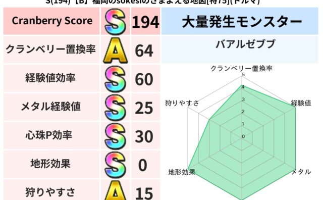 スコアS S(194)【B】福岡のsokesiのさまよえる地図[特75](ドルマ) クランベリーボット判定結果の詳細クランベリースコア194クランベリー置換率64%大量発生モンスターバアルゼブブ超耐性ドルマ(0%)超耐性・弱耐性なしデインこころ道 完全一致モンスターさまようよろいゴッドハンド(守護道Lv5)マジカルハット大... 2025/05/08 23:44 スコアS地図判定結果