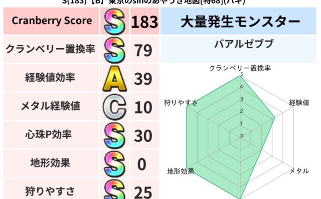 スコアS S(183)【B】東京のsinのあやうき地図[特68](バギ) クランベリーボット判定結果の詳細クランベリースコア183クランベリー置換率79%大量発生モンスターバアルゼブブ超耐性バギ(0%)超耐性・弱耐性なしデインこころ道 完全一致モンスターヘルボックル魔剣士(魔道Lv30)ストーンマンゴッドハンド(... 2025/04/30 10:30 スコアS地図判定結果置換率S