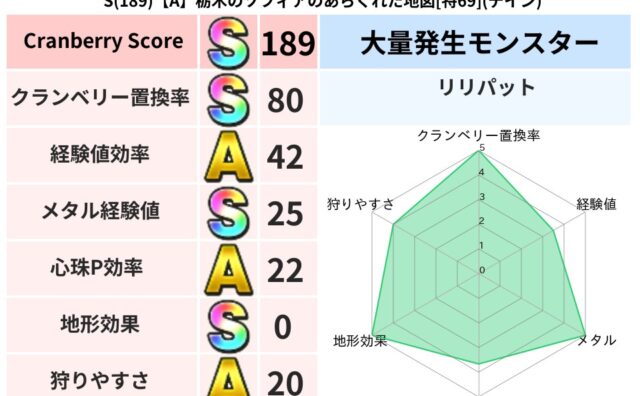 スコアS S(189)【A】栃木のソフィアのあらくれた地図[特69](デイン) クランベリーボット判定結果の詳細クランベリースコア189クランベリー置換率80%大量発生モンスターリリパット超耐性デイン(0%)こころ道 完全一致モンスターかっちゅうアリ魔人(共通Lv1)パペットマン天地雷鳴士(天道Lv5)ストーンマンゴッ... 2025/02/23 00:00 スコアS地図判定結果置換率S