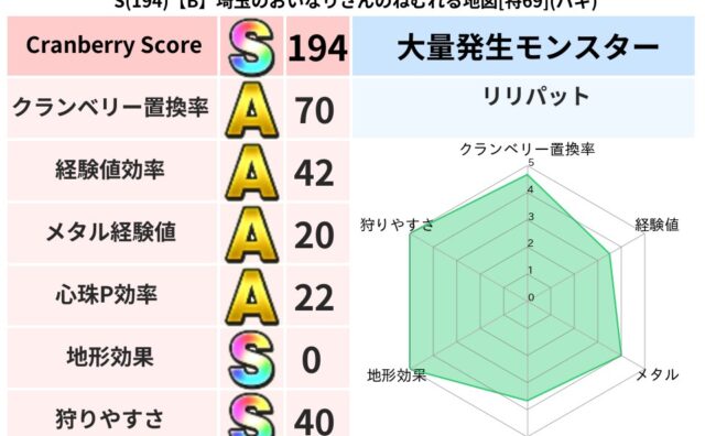 スコアS S(194)【B】埼玉のおいなりさんのねむれる地図[特69](バギ) クランベリーボット判定結果の詳細クランベリースコア194クランベリー置換率70%大量発生モンスターリリパット超耐性バギ(0%)超耐性・弱耐性なしデインドルマ系統狩り怪人系41%こころ道 完全一致モンスターキャットフライニンジャ(共通Lv1)... 2025/04/13 20:04 スコアS地図判定結果